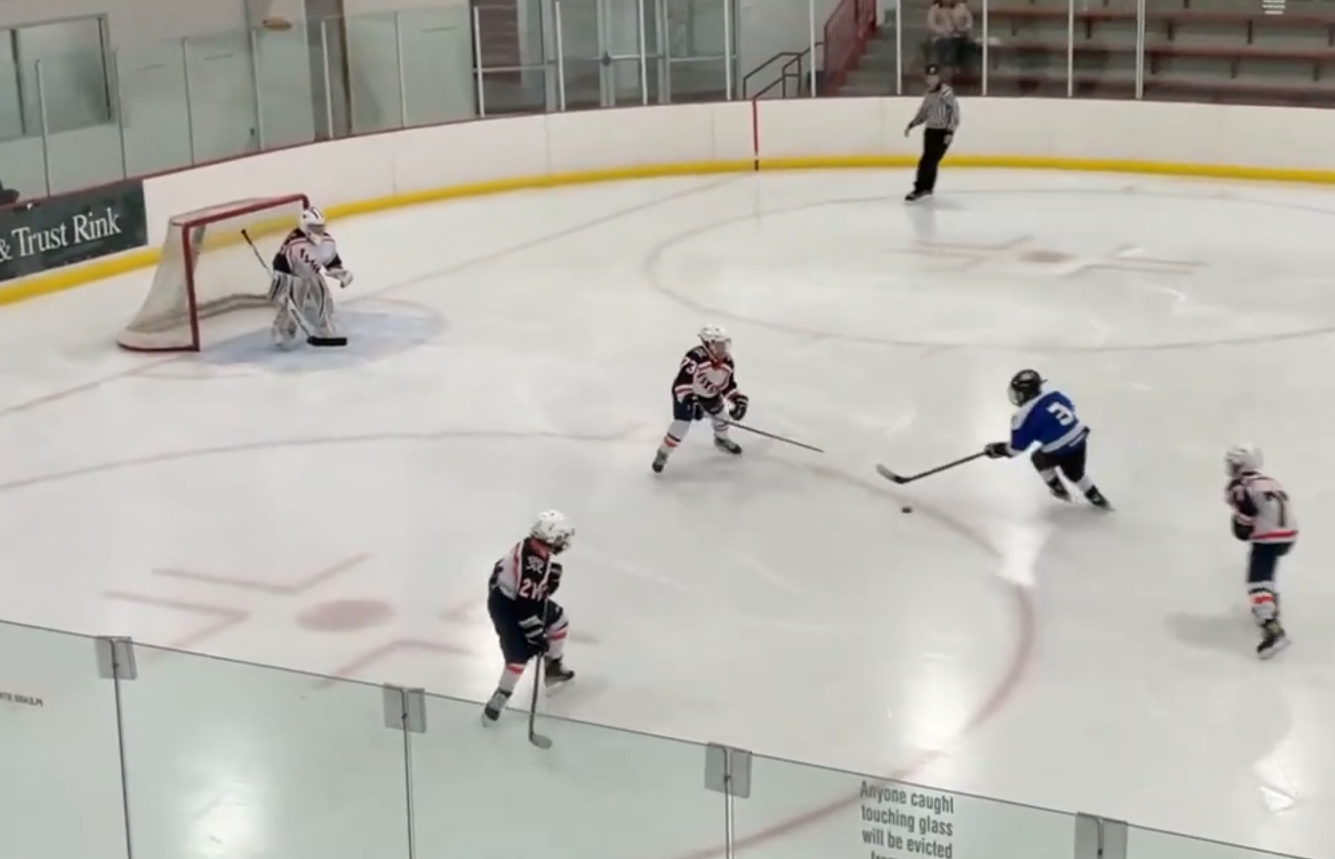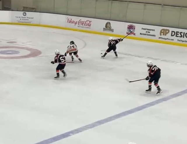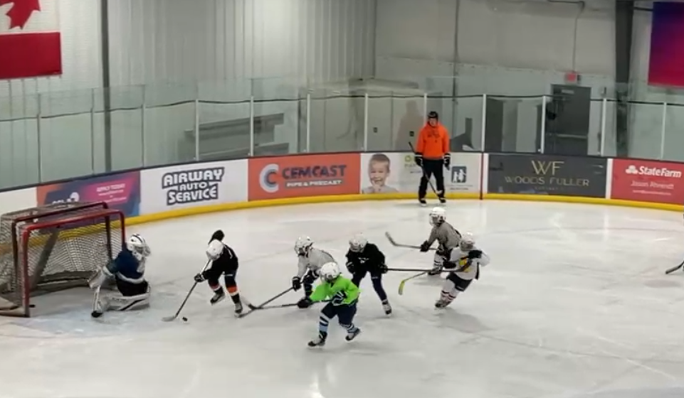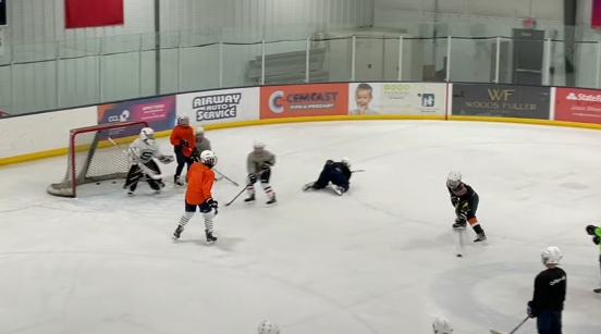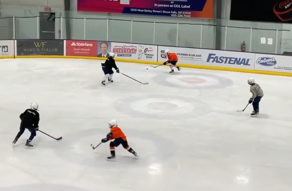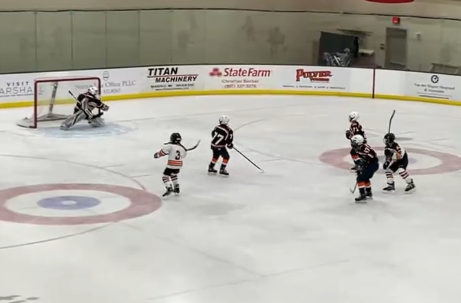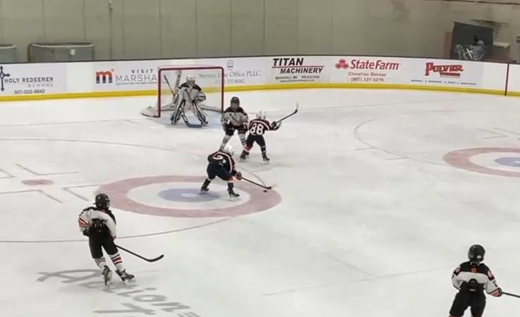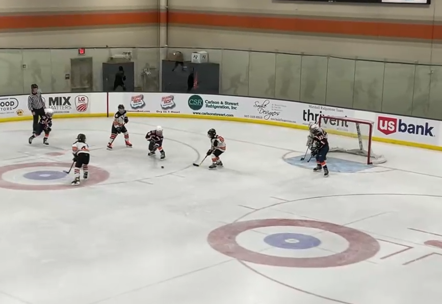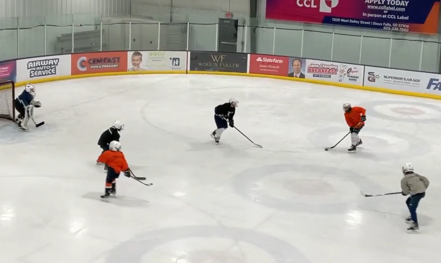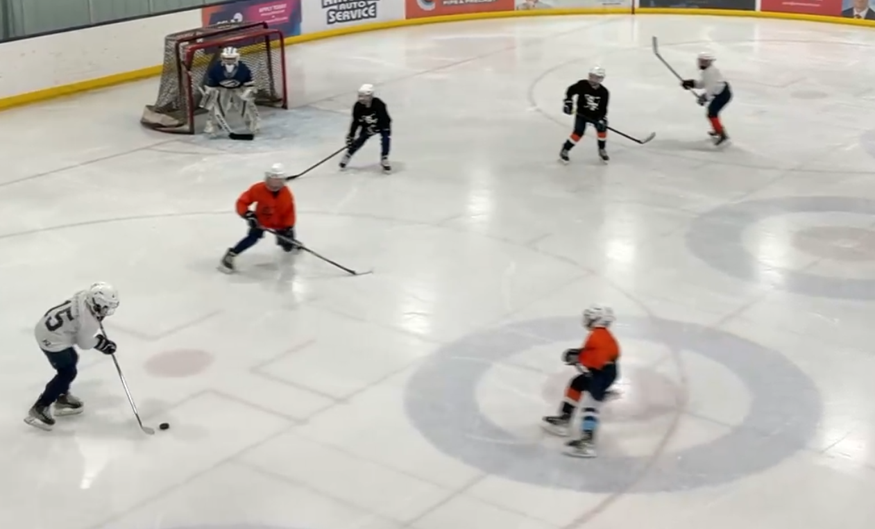 Great job of the orange forwards getting out and closing out shots. The spacing by all 10 players is great. Mathew does a good job actively in net.