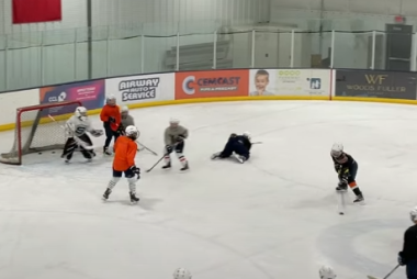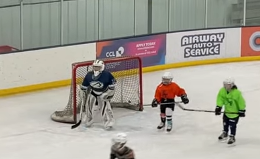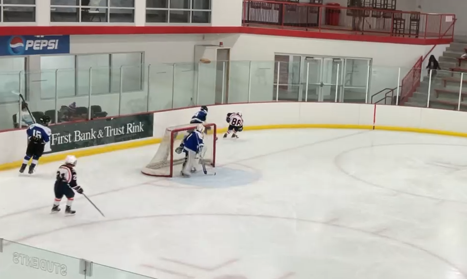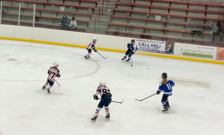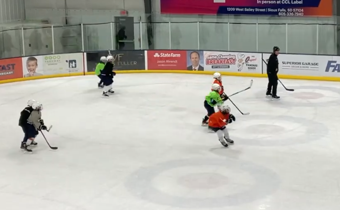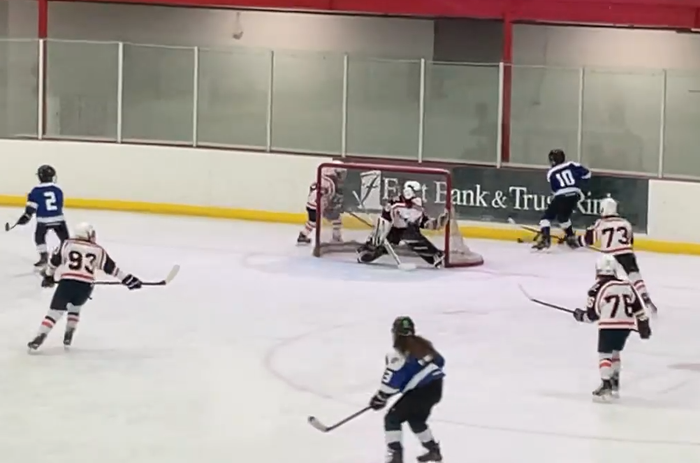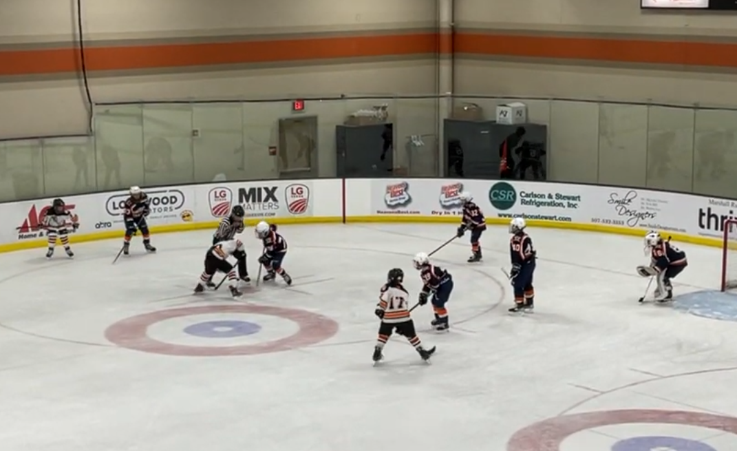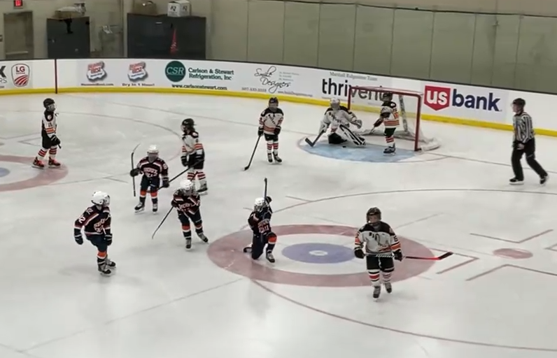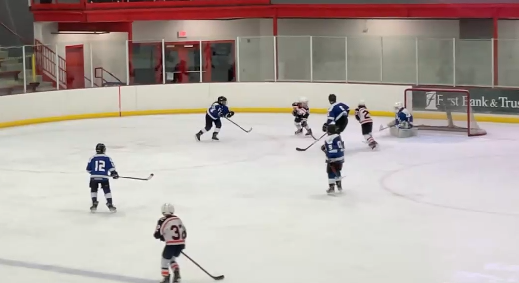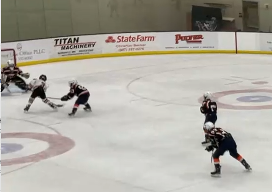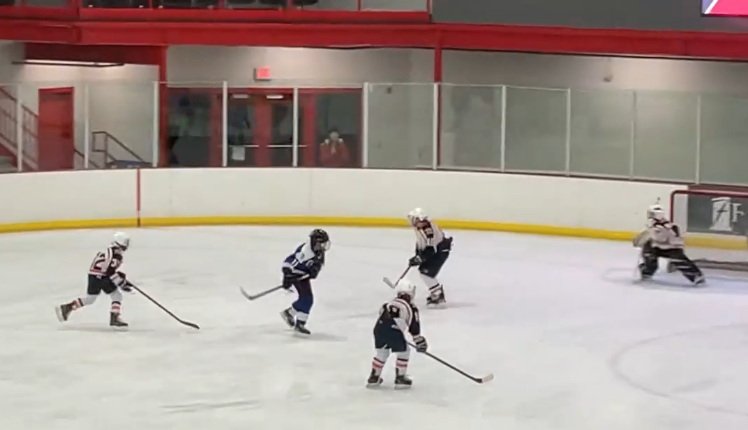 Great job of the orange forwards getting out and closing out shots. The spacing by all 10 players is great. Mathew does a good job actively in net.